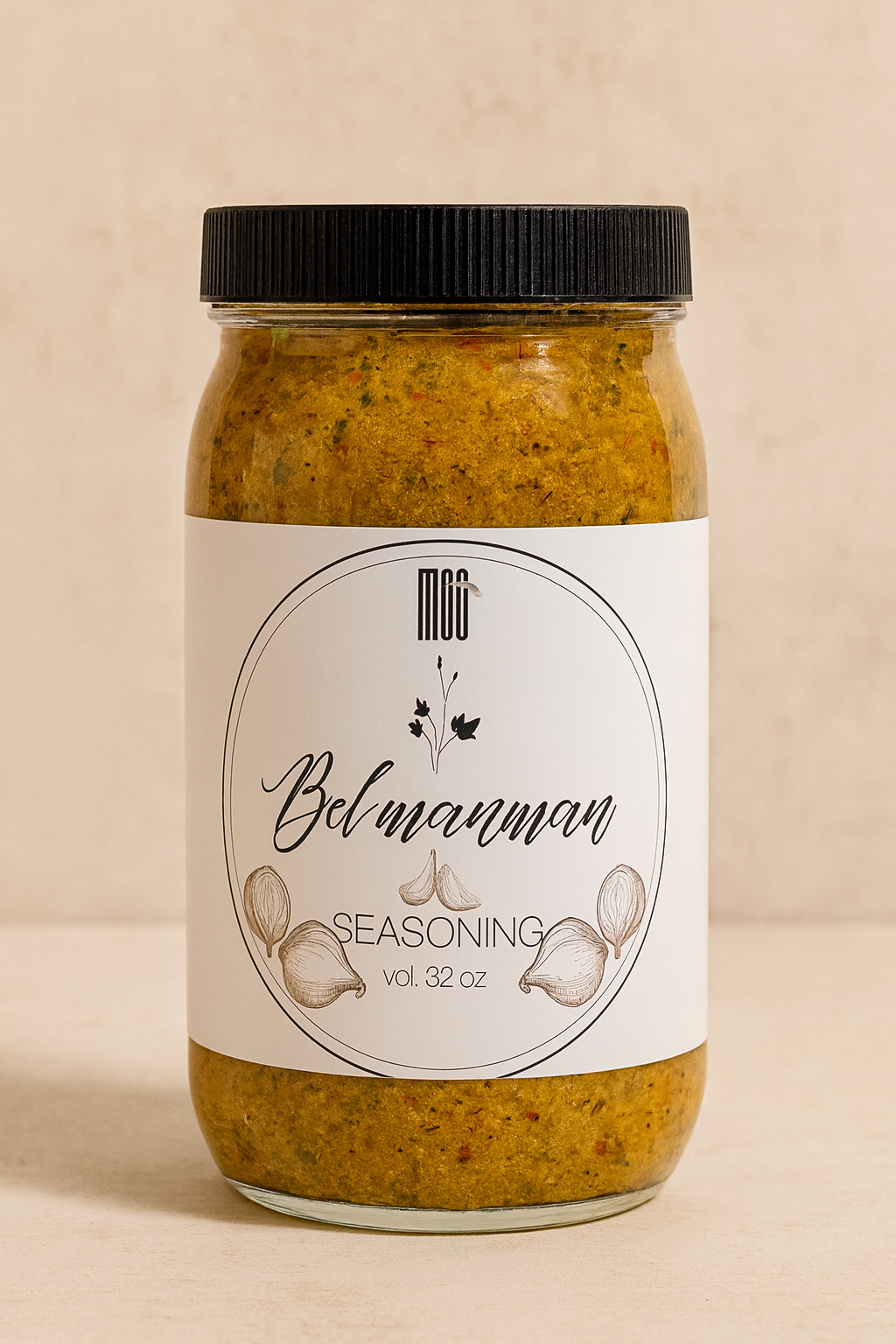 Bring home the soul of Haitian cooking with Belmanman Seasoning — a handcrafted blend of fresh herbs and spices made with love and tradition.